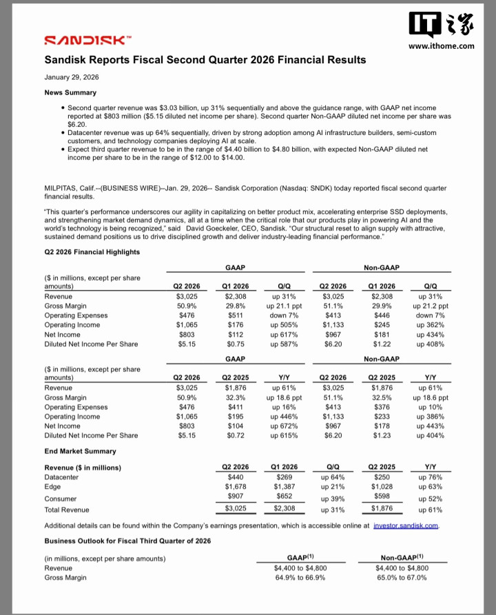 闪迪Q2营收为30.25亿美元,环比增长31%,超出指导范围;按照公认会计原则(GAAP)计算的净利润为8.03亿美元(摊薄每股净利润5.15美元)。第二季度非GAAP摊薄每股净利润为6.20美元。